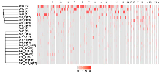 Heatmap showing significant large-scale amplification events in CTCs per whole chromosome. In this heat map, the chromosome number are arranged from left top to right, and 21 CTCs analysed flow vertical, top to bottom. Significant genomic amplifications are represented in red and the red intensity can vary according to the number of copies amplified. P = patient.