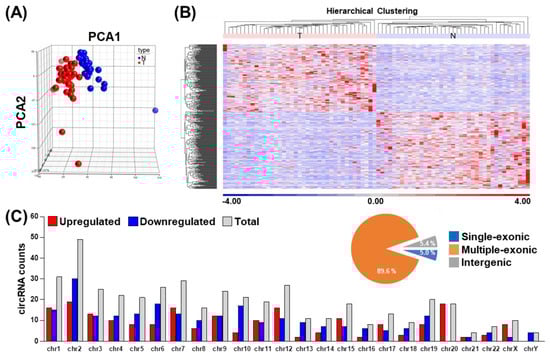 The circRNA transcriptome landscape in primary oral squamous cell carcinoma (OSCC) tumor tissues. Using the OSCC RNA-seq dataset, circRNA expression levels were determined based on the normalized read count values. (A) Principal component analysis (PCA) of normal vs. tumor tissues generated on the basis of identified circRNAomes. (B) Hierarchical clustering analysis of circRNAs differentially expressed in tumor vs. normal tissues (n = 443), which illustrates the distinction of differential expression profiles corresponding with disease state. (C) The distribution of differentially expressed circRNAs on the basis of chromosomal location. Sequence composition for circRNAs, including single-exonic, multiple exonic, and intergenic types are presented as circle plot in the upper right panel.