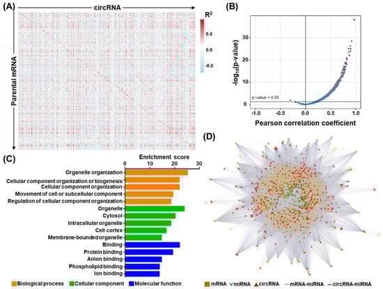 Transcriptomic networks in association with circRNAs in OSCC. (A) Gene co-expression analysis was performed between differentiated expressed circRNAs (horizontal axis) and their parental mRNA genes (vertical axis), based on the expression levels shown by OSCC RNA-seq data. The co-expression map is depicted as a heatmap, in which the correlation coefficients are represented by the colors shown by the scale bar in the right panel. (B) Extent of coordinated expression for circRNA and host mRNA pairs presented as a volcano/scatter plot, according to each pair’s correlation coefficient (x-axis) and significance (p-value; y-axis). (C) Gene ontology (GO) enrichment analysis of DEC-encoding host genes was performed. The x-axis indicates the significance of enrichment for the indicated term. (D) Construction of the circRNA–miRNA–mRNA regulatory network in OSCC. The miRNA interactions were predicted for each circRNA–mRNA pair with correlated expression in the OSCC specimens (padj < 0.05, cor > 0). A three-tier, ceRNA connection was established if an miRNA-targeted sequence was commonly found in the mRNA–circRNA pair (i.e., with a least two hits in circRNA). mRNA, squares; miRNA, inverted triangles; circRNA, triangles; miRNA–mRNA interaction, gray line; circRNA–miRNA interaction, blue line.