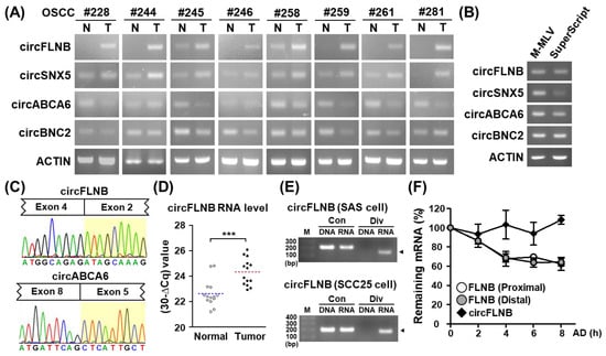 Validation and characterization of differentially expressed circRNAs in OSCC. (A) Expression of selected circRNAs in paired OSCC specimens was detected by end-point PCR. ACTIN gene expression was used as the loading control. (B) End-point PCR analyses of complementary DNA (cDNA) generated by M-MLV or SuperScript reverse transcriptases were performed to exclude the detection of artificial circRNA. ACTIN was used as the internal control. (C) Two exemplary circRNAs were PCR-amplified, and then subjected to Sanger sequencing. Histograms illustrate the junctional sequences flanking the back-splicing sites (with exons indicated above). (D) Upregulated circFLNB expression in tumor samples vs. adjacent normal tissues was confirmed by qRT-PCR analysis of an independent patient cohort. TBP gene expression was used as an internal control. For statistical analyses shown in this figure: *** p < 0.001. (E) PCR of genomic DNA (DNA) and reverse-transcribed cDNA (RNA) was performed with primers in the convergent (Con) and divergent (Div) orientations and analyzed by gel electrophoresis. (F) To monitor transcript stability, SAS cells were treated with actinomycin D (AD) for the indicated time lengths, then harvested for qRT-PCR-based gene expression analysis. RNA turnover rate was measured by normalization of RNA abundance relative to the initial time point and plotted for each indicated gene.