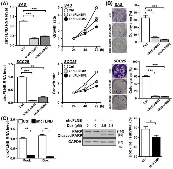 circFLNB is critical for maintaining oral cancer cell growth. The oral cancer lines SAS and SCC25 were subjected to circFLNB knockdown by means of lentiviral infection (shcFLNB#1 and shcFLNB#2), and knockdown efficacy was assessed by qPCR. Cell proliferation rate (A) and colony formation ability (B) of the knockdown cells were assessed by the MTT method and crystal violet staining, respectively. In (B), representative images (left) and quantified results based on colony area (right) are shown. (C) Control and circFLNB knockdown cells were treated with doxorubicin to induce apoptosis. PARP protein expression/cleavage (middle) and extent of cell survival (right) of the treated cells were analyzed by Western blot and MTT assays, respectively. GAPDH expression was used as the loading control. For statistical analyses shown in this figure: * p < 0.05; ** p < 0.01; *** p < 0.001.