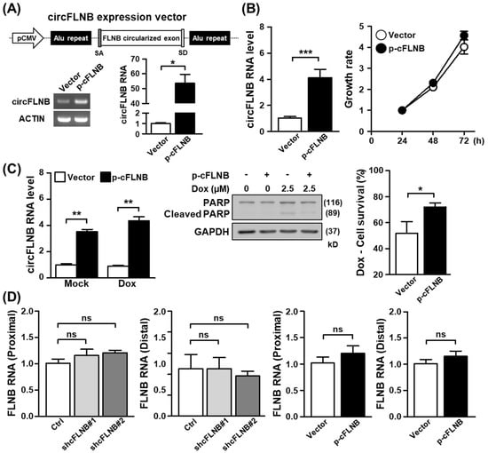 The circFLNB promotes cell survival under apoptotic stress. (A) Ectopic expression construct of circFLNB (p-cFLNB) was established by sub-cloning the circularized exons of circFLNB together with the flanking Alu repeats into a CMV-driven expression vector backbone. Overexpression efficacy in cells was monitored by end-point PCR and qPCR assays. (B) SAS cells were infected with control and p-cFLNB constructs, and subsequently analyzed for circFLNB expression and proliferation rate by qPCR and MTT methods, respectively. (C) Control and circFLNB overexpression cells were treated with 2.5 µM doxorubicin to induce cell death, and PARP protein expression/cleavage and cell survival were monitored as in Figure 4. (D) Expression levels of the parental FLNB gene in cells with circFLNB knockdown or overexpression was detected by qPCR assay, by using primers corresponding to FLNB transcript regions proximal or distal to the back-splicing junction. For statistical analyses shown in this figure: ns p > 0.05; * p < 0.05; ** p < 0.01; *** p < 0.001.