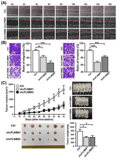 The circFLNB modulates migratory and invasive capability in OSCC. (A) The wound healing migration assay was performed to assess the migratory ability of SAS cells upon circFLNB knockdown. Photographs were taken at the indicated time points after cells were scratched, with representative images shown. (B) Transwell migration (left) and Matrigel invasion (right) assays were carried out after knockdown of circFLNB in SAS cells. The representative photomicrographs are shown. Average migratory area per field was quantified and expressed as a percentage relative to control cells (Ctrl). (C) The mouse xenograft experiment was performed by inoculating control and circFLNB knockdown SAS cells. Tumors formed at the indicated time points were dissected and measured for the volume (upper left). The right panel shows photographs of mice bearing tumors (top right) and the surgically removed tumors (bottom left). The bar graph depicts average weights (n = 10 or 11) of the tumor masses dissected from the indicated groups at sacrifice (day 41). For statistical analyses shown in this figure: * p < 0.05; ** p < 0.01; *** p < 0.001.