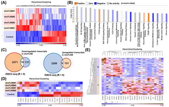 Transcriptome-wide exploration of circFLNB-mediated regulatory network. (A) Transcriptome-wide changes in circFLNB knockdown cells were profiled by RNA-seq. Overall profiles of the differentially expressed genes in the control and knockdown groups (as indicated) are represented by the heatmap. The expression values (represented by normalized read counts) are displayed in shades of red or blue (linear scale) relative to the means of all corresponding values within individual experimental groups. Clusters of genes (based on unsupervised hierarchical clustering) are indicated and denoted by their experimental types/conditions. (B) Differentially expressed genes (DEGs) were subjected to pathway analysis using the Ingenuity Pathway Analysis (IPA) tool. (C) Venn diagrams illustrate the degree of overlap between the circFLNB-correlated genes as shown by OSCC-specimen RNA-seq (OSCC-seq) and those differentiated expressed in the circFLNB knockdown experiments. To identify potential downstream targets of circFLNB, positively-correlated genes (R > 0) were intersected with downregulated DEGs in circFLNB knockdown (left; n = 18), while inversely correlated genes (R < 0) were intersected with upregulated DEGs (right; n = 9). (D, E) The distribution of the expression profiles of the 27 intersected genes uncovered in (C) are shown as heatmaps in the circFLNB knockdown experiments (D) and the OSCC samples from the 39 patients (E).