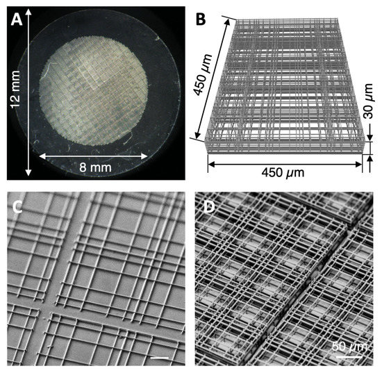 The micro-structures used for cell culture in this study, later referred as “Nichoid” substrates (Figure 1A), were fabricated by 2PP as previously described in detail [25]. The biocompatible photopolymer SZ2080 was used with 1% of Irg photo-initiator (Irgacure 369, 2-Benzyl-2-dimethylamino-1-(4-morpholinophenyl)-butanone-1). The laser used for 2PP was a cavity-dumped Yb:KYW system producing pulses with 300-fs duration and 1-MHz repetition rate (1030 nm wavelength) focused with a 1.4 numerical aperture (NA) oil immersion objective (Carl Zeiss, Oberkochen, Germany). Computer-controlled, three-axis motion stages (ANT130, Aerotech, Pittsburgh, PA, USA) were used to control sample motion around the laser focal spot. A total of 218 elementary blocks of niches were laser written directly onto circular glass cover slips (150 µm thickness and 12 mm diameter, BioOptika, Milan, Italy). As shown in Figure 1, two types of elementary blocks were fabricated. One with a single-layered geometry (later referred to as 2D Nichoid) consisting of single interconnected rods (450 µm wide and 450 µm long) forming 25 repetitive units (90 µm × 90 µm), as shown in Figure 1C. The second type of Nichoid, the 3D one, consisting of similar 25 repetitive units (30 µm high, 450 µm wide and 450 µm long) composed of 25 units (30 µm high and 90 µm × 90 µm in transverse dimensions) consisting of three piled up layers, each with the same architecture of the 2D Nichoid, made of interconnected rods, with a graded transverse spacing between 10 and 30 µm, and a uniform vertical spacing of 15 µm (see Figure 1B,D). The spacing between adjacent blocks was set to 30 µm, as shown in Figure 1D.