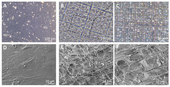 The innovative 2D and 3D cell culture substrates Nichoid, fabricated by 2PP using an organic-inorganic photoresist (SZ2080), are represented in Figure 1. The photo-polymerized Nichoid micro-lattice has a Young’s modulus of 0.138 ± 0.008 GPa [24] and a porosity of 91% in terms of ratio between void volume and total volume of the structure. The result is that 88% of the available cell culture surface was covered by the 3D Nichoid [25]. The innovative 3D Nichoid substrate was used as a culture system to study MSCs adhesion and growth, morphology, proliferation, motility and gene expression in comparison to a single-layered 2D Nichoid and to a flat glass, respectively.