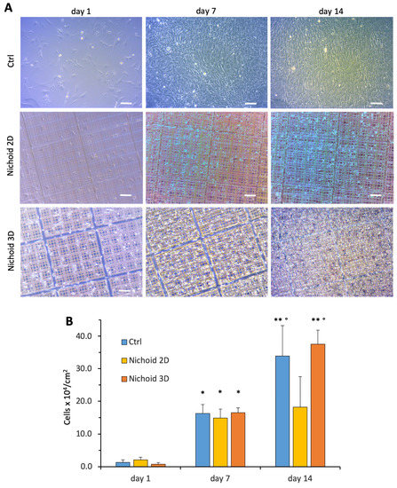 MSCs expansion on control and Nichoid structures. (A) Live images of rat MSCs cultured in control monolayer (upper panels), on the 2D Nichoid (middle panels) and on the 3D Nichoid (lower panels). Bars represent 100 µm. (B) Cell number × 104 per cm2 after cell culture in flat control monolayer (Ctrl) or in the 2D Nichoid and 3D Nichoid substrates, (number of replicates n = 3–4 for each group). Data are presented as mean ± SD. * p < 0.01 vs. same group at Day 1, ** p < 0.01 vs. same group at Day 14 and ° p < 0.01 vs. 2D Nichoid (ANOVA and Bonferroni’s correction for multiple comparisons).