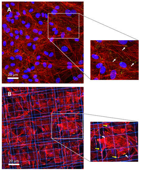 Immunofluorescence staining to F-actin and pFAK in MSCs in flat control monolayer (A) and in the 3D Nichoid (B). Focal adhesion contacts (yellow staining as merge of pFAK green staining and F-actin red staining) are highlighted by white arrows for adhesion of MSCs on flat surface (Inset A). In MSCs on 3D Nichoids, focal adhesions are present on cells adherent on flat substrate (Inset B—white arrows) and also on the Nichoid structure (Inset B—yellow arrows).