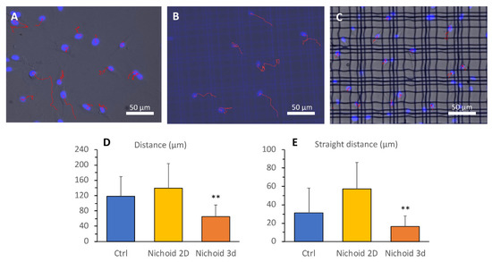 Cell motility. Immunofluorescence images and tracking of cell movements during 7 h acquisition in flat control monolayer (A), in the 2D Nichoid (B), and in the 3D Nichoid (C). (D) Quantification of the cell distance (or path, calculated as the sum of all the distances travelled) and (E) of the cell straight distance (or displacement, calculated as the net distance from the initial position to the final position) of cells cultured on flat control monolayer (Ctrl), 2D Nichoid and 3D Nichoid substrates (number of replicates n = 4 for each group, with total number of cells analyzed ranging from 38 to 60). Data are presented as mean ± SD, ** p < 0.001 vs. Ctrl and vs. 2D Nichoid.