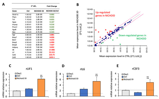 Gene expression analysis of MSCs cultured on the 3D Nichoid substrate. (A) Table of up- or down-regulated genes. (B) Scatter plot graph showing the expression level ((2^(-DDCt)) of each gene in the 3D Nichoid sample versus the flat control monolayer. The black line indicates the fold changes of 1, the pink lines indicate the fold changes of 2. Real-time PCR analysis for the expression of rLIF1 (C), rIL6 (D) and rCSF3 (E) in cells at day 1 (Day1) and in cell expanded for 2 weeks in the substrates (Ctrl and 3D Nichoid, n = 3 for each condition). Data are presented as mean ± SD, °° p < 0.01 vs. Day1, ** p < 0.01 vs. Ctrl (ANOVA and Bonferroni’s correction for multiple comparisons).