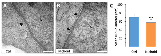 Ultrastructural analysis of the nuclear envelope. Transmission electron microscopy (TEM) images of MSCs cultured on flat control monolayer (A) or in the 3D Nichoid (B) for 7 days. N, nucleoplasm; C, cytoplasm. Black arrows indicate nuclear pores. (C) Quantification of mean nuclear pore diameter in MSCs expanded on control monolayer or in the 3D Nichoid. Bar represents 200 nm. Data are presented as mean ± SD, *** p < 0.001 (Student’s t test).