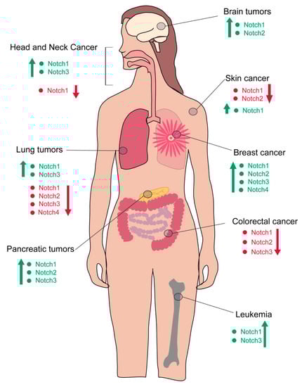 Differential regulation of Notch activity in various types of cancer. Depending on the cancer type, the Notch pathway can be hyper- or hypo-activated. Specific Notch receptors are involved in this differential regulation. Hyperactivation of the pathway through specific receptors is indicated in green. Repression of Notch activity is indicated in red. In some organs, both activation and repression of the pathway have been reported, depending on the subtype of tumors or the model system analyzed.