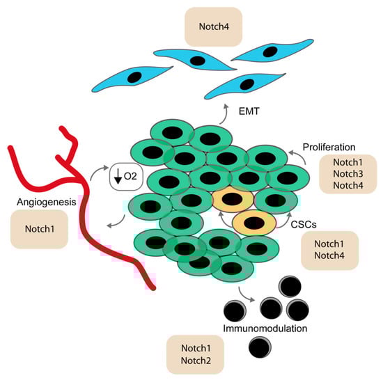 Immune cells can be recruited to participate in the tumor microenvironment and can have either a repressive or an oncogenic effect. The Notch pathway is a central regulator of immune differentiation. It is responsible for the differentiation of lymphocytes and myelomonocytic via inhibition of Hes1 transcription []. Additionally, the toll-like receptor (TLR) in macrophages and dendritic cells upregulates the expression of Jag1, Dll1 and Dll4, promoting Notch pathway activation []. Tumor-associated macrophages have been described in a variety of solid tumors (among others breast, bladder, ovarian and head and neck cancer) []. High levels of Notch1 correlates to higher numbers of tumor-associated macrophages (TAMs) in head and neck cancer and NOTCH1 and NOTCH2 induce a TAM-anti-inflammatory phenotype via JAG1 [,]. Their activation depends on CSL, and selective depletion in TAMs blocks their differentiation, promoting a cytotoxic microenvironment [,].
