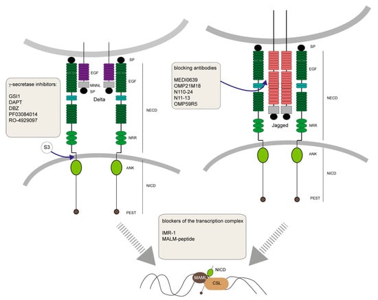 Another way of targeting the Notch signaling pathway is achieved by the development of small molecules resulting in the blockage of transcription by either blocking the formation of the transcription complex or receptor–ligand interactions (Figure 3).