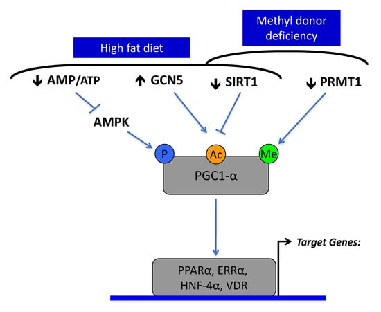 The decreased expression and activity of Sirtuin1 is a common molecular hallmark in a high fat diet and methyl donor deficiency (MDD). Sirtuin1 targets the acetylation of peroxisome proliferator-activated receptor-γ coactivator-1α (PGC1α) and has a complementary role with GCN5 acetylase, AMP kinase and protein arginine methyltransferase (PRMT1) in the regulation of PGC1α activation of nuclear receptors, including PPARα, ERRα, HNF-4α and VDR. PGC1α is phosphorylated and acetylated under the control of AMP kinase (AMPK), GCN5 acetylase and SIRT1 deacetylase. High fat diet and over nutrition decrease activity of AMP kinase, through high intracellular ATP levels, leading to decreased phosphorylation of PGC-1 α. It produces hyperacetylation of PGC-1α through increased expression of GCN5 and decreased expression and activity of SIRT1. MDD produces similar effects through decreased SIRT1 and PRMT1.