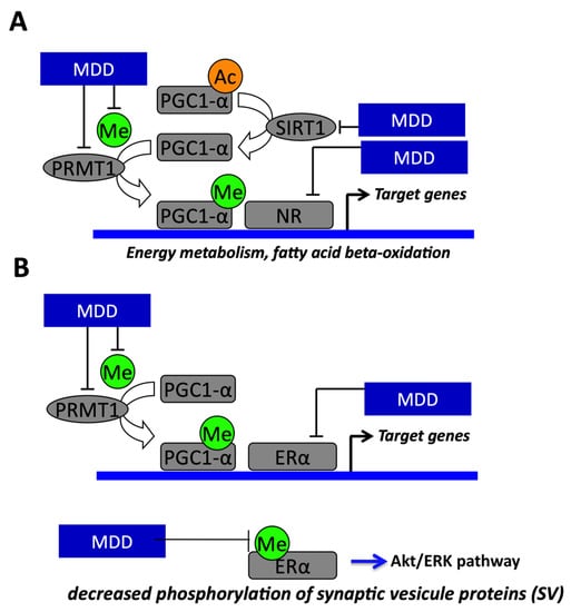 MDD during pregnancy and lactation induces impaired fatty acid oxidation, reduced activity of complexes I and II, cardiac hypertrophy with enlargement of cardiomyocyte and liver steatosis in weaning rat pups [,]. These observations are linked to the hyperacetylation and hypomethylation of PGC1α and dissociation of PGC1α from PPARα through decreased expression of Sirt1 and protein arginine methyltransferase 1 (PMRT1; Figure 2 and Figure 3) []. MDD weakens the activator activity of PGC1α for other nuclear receptors, including estrogen receptor-α (ER-α), estrogen-related receptor-α, hepatocyte nuclear factor 4 (HNF-4) and vitamin D receptor (VDR). The liver steatosis of pups born from mothers with MDD during pregnancy and lactation resulted predominantly from hypomethylation of PGC1α, the decreased binding with its partners, including PPARα and HNF4 and the subsequent impaired mitochondrial fatty acid oxidation []. The effects of fetal programming on the liver of rats born from MDD mothers are worsened when pups are subsequently subjected to a high fat diet (HF) after d50 []. The MDD/HF animals have hallmarks of steato-hepatitis, with increased markers of inflammation and fibrosis, insulin resistance and key genes triggering the pathomechanisms of non-alcoholic steato-hepatitis (NASH; transforming growth factor beta super family, angiotensin and angiotensin receptor type 1). These data show that MDD during pregnancy is a risk factor of NASH in populations subsequently exposed to a HF diet. The deactivation of PGC1α is also involved in the brain manifestations of MDD fetal programming in rats. MDD during gestation and lactation alters the cerebellum plasticity in offspring, with a lower expression of synapsins. The altered neuroplasticity results from decreased expression and methylation of ER-α and subsequent decreased ER-α/PPAR-γ coactivator 1 α (PGC-1α) interaction in the deficiency condition. The impaired ER-α pathway leads to decreased expression of synapsins through a decreased EGR-1/Zif-268 transcription factor and Src-dependent phosphorylation of synapsins []. Deficiencies in methyl donors and in vitamin D are independently associated with altered bone development. In young rats, MDD decreases the total body bone mineral density, reduced tibia length and impaired growth plate maturation, and in preosteoblasts, MDD slows cellular proliferation. MDD produces a decreased expression of VDR, estrogen receptor-α, PGC1α, PRMT1 and Sirt1 and decreased nuclear VDR-PGC1α interaction []. The weaker VDR-PGC1α interaction is attributed to the reduced expression and imbalanced methylation/acetylation of PGC1α and the nuclear VDR sequestration by heat shock protein 90 (HSP90). These mechanisms together compromise bone development, as reflected by lowered bone alkaline phosphatase and increased proadipogenic PPARγ, adiponectin and estrogen-related receptor-α expression [].