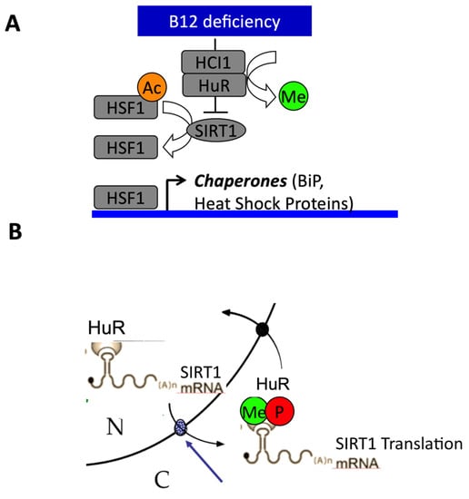 Influence of vitamin B12 cellular availability on endoplasmic reticulum (ER) stress-related decreased expression of Sirtuin1 (Sirt1). (A) The decreased cellular availability in B12 activates ER stress pathways and decreases the expression of heat shock proteins through decreased expression of Sirt1 and subsequent hyperacetylation of heat shock factor 1 (HSF1). (B) The decreased cellular availability in B12 produces the subcellular mislocalization of the ELAVL1/HuR RNA binding protein implicated in response to ER stress through hypomethylation by decreased synthesis of methyl S-adenosyl methionine (SAM) and dephosphorylation by increased protein phosphatase PP2A. The blue arrow shows the nuclear pore complex. The mislocalization of ELAVL1/HuR triggered the decreased expression of Sirt1 by altered Sirt1 mRNA export from nucleus to cytoplasm.