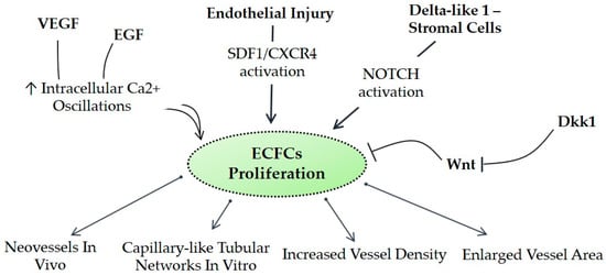 One of the most relevant signals that control ECFC proliferation and differentiation is the Ca2+ concentration. An increase in intracellular Ca2+ concentration has long been known to play a crucial role in angiogenesis [41,42,43,44]. Similar to mature endothelial cells, ECFCs require an increase in Ca2+ to proliferate, assemble into capillary-like tubular networks in vitro, and form neovessels in vivo [41]. There are three main Ca2+-transporting systems, the plasma membrane Ca2+ ATPase, the Na+/Ca2+ exchanger (NCX), and the sarco-endoplasmic reticulum Ca2+ ATPase (SERCA), which sequester cytosolic Ca2+ into the endoplasmic reticulum (ER). Due to their close proximity to the blood system, ECFCs are constantly in contact with and stimulated by soluble factors. Most of those factors act through regulation of Ca2+ concentration. For instance, epidermal growth factor (EGF) triggers pro-angiogenic oscillations in Ca2+ in rat coronary microvascular endothelial cells [45]. On the other hand, VEGF elicits a transient increase in Ca2+ [46].