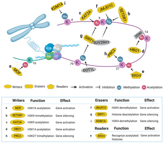 Histone writers such as lysine methyltransferases (KMTs) and lysine acetyltransferases (KATs) are a subclass of epigenetic writers that modify histones through the addition of methyl and acetyl moieties [40]. KMTs methylate lysine residues, resulting in three possible modification states: mono-, di-, or trimethylation. In particular, methylation on lysine residues 9 and 27 of histone H3 (H3K9, H3K27) is highly associated with transcriptional repression, whereas methylation on H3K4 and H3K79 is relevant to transcriptional initiation [44]. For example, the disruptor of telomeric silencing 1-like (DOT1L) protein specifically mediates methylation of H3K79 and induces expression of downstream genes including homeobox A (HOXA) clusters (required for embryonic development) and MEIS1 (required for hematopoiesis) in MLL-r leukemia—an aggressive family of acute leukemia driven by rearrangement of the mixed lineage leukemia (MLL1) gene [45,46]. KATs acetylate histones at various positions (H3K9, H3K14, H3K27, H4K12, and H4K16, etc.), and these modifications are generally associated with an open, accessible chromatin state [47]. Several KATs such as KAT3A (CBP) and KAT3B (p300) are known to be required for AML cell survival [48,49]. Here, we summarize the histone writers found specifically through genetic library screens in AML.