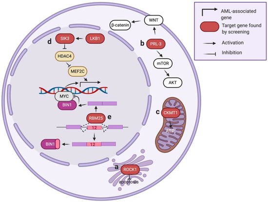 Gene expression prior to protein translation can be divided into two major steps: gene transcription and RNA processing. Dysregulation of these steps may mislead the expression of cancer-related genes and trigger leukemia development [104]. For example, mutations of transcription factor RUNX1 support AML development by promoting the expression of hematopoiesis and cell cycle-related genes [105]. Mutations in the RNA splicing factors SF3B1 and SRSF2 are frequently found in AML patients and are associated with drug resistance [106]. These studies underscore a strong relationship between gene expression regulators and AML pathogenesis. Here, we summarize AML-related gene expression regulators identified from functional genetic screens.