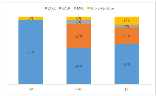 Mutations in JAK2, CALR and MPL are mutually exclusive [17]. Each driver mutation has unique disease kinetics that lead to clone expansion and acquisition of coexisting mutations. The frequency of each driver mutation is displayed in Figure 1.