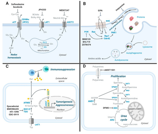 Amino acid metabolic pathways altered in cancer and select inhibitors targeting these pathways. (A) Three main amino acid transporters (AATs) upregulated in cancer cells and transporter-targeting inhibitors that are either being used clinically or tested in clinical trials are shown. (B) A simplified macropinocytosis process is depicted and inhibitors targeting the process are shown. Rat sarcoma virus oncogene homolog (Ras) and phosphatidylinositol-3-kinases (PI3Ks) positively regulate macropinocytosis by promoting Rac1 and Cdc42-mediated actin polymerization. (C) Kynurenine is a catabolite derived from tryptophan. Key enzymes in the kynurenine synthesis pathway, regulatory mechanisms of kynurenine, and IDO/TDO inhibitors tested in clinical trials are shown. (D) Polyamines are catabolites derived from arginine. Polyamine synthesis and catabolic pathways are depicted, and polyamine metabolism inhibitors tested in clinical trials are shown. Metabolites are in grey, proteins are in blue, and inhibitors are in black. Proteins: ASCT2: Alanine-serine-cysteine transporters 2; LAT1: L-type amino acid transporter 1; xCT/CD98hc: 4FC2 cystine/glutamate heterodimeric antiporter; GLS: Glutaminase; GS: Glutamine synthetase; NHE: Na+/H+ exchanger; Rac1: Ras-related C3 botulinum toxin substrate 1; Cdc42: Cell division control protein 42; PAK1: P21-activate kinase 1; PI3K: Phosphoinositide 3-kinases; IDO1/2: Indoleamine-2,3-dioxygenase 1,2; TDO: Tryptophan-2,3-dioxygenase; AFMID: Kynurenine formamidase; AhR: Aryl hydrocarbon receptor; ARNT: Aryl hydrocarbon receptor nuclear translocator; ARG: Arginase; ODC: Ornithine decarboxylase; AMD1: S-adenosylmethionine decarboxylase 1; SPDSY: Spermidine synthase; SPMSY: Spermine synthase; SAT1: Spermidine/spermine N1-acetyltransferase; PAO: Polyamine oxidase. Metabolites: Cys-Cys: Cystine; Cys: Cysteine; Gly: Glycine; Glu: Glutamate; Gln: Glutamine; Neutral AAs: Neutral amino acids (alanine, serine, cysteine, glutamine); BCAAs: Branched-chain amino acid (valine, leucine, isoleucine); bulky AAs: Bulky amino acids (phenylalanine, methionine, histidine, tryptophan, tyrosine); Trp: Tryptophan; N’-formylkyn: N’-formylkynurenine; Kyn: Kynurenine; Cit: Citrulline; Arg: Arginine; Orn: Ornithine; SAM: S-adenosylmethionine; dcSAM: Decarboxylated. Cells: Th: T-helper cell; Treg: Regulatory T cell. Inhibitors: DFMO: Difluoromethylornithine.