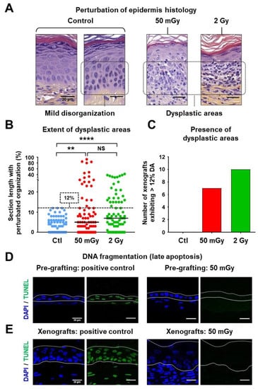 Local dysplastic areas developed in xenografted epidermises originating from irradiated keratinocyte precursors. (A) HES coloration of human skin samples 20 days post-xenografting. Representative pictures were selected for the visualization of the normal histology of control epidermises, the mild disorganization considered as the background of the xenograft model, and examples of dysplastic areas (DA) that were characteristic of irradiated conditions. (B) Estimation of the percentage of tissue section length displaying mild disorganization or DA. A total of 14 xenografts were performed for the control (Ctl) and 50 mGy conditions, and 13 were performed for the 2 Gy condition. Dot plots cumulated the analyses of 6 sections for each xenograft. Bars correspond to median values (NS p > 0.05; ** p < 0.01; **** p < 0.0001, Mann–Whitney U test). (C) The histogram shows the numbers of xenografts that displayed DAs corresponding to at least 12% of epidermis section length: n = 7 out of 14 xenografts for the 50 mGy condition; n = 10 out of 13 xenografts for the 2 Gy condition. (D,E) Search for genomic DNA fragmentation associated with late apoptosis using the terminal deoxynucleotidyl transferase dUTP nick-end labeling (TUNEL) assay in pre-grafting skin substitutes (24 h post-irradiation) (D) and 20 days post-xenografting (E). Technical positive controls corresponded to sections treated with DNase. Nuclei were colored with DAPI. No signal was detected either in the sham-irradiated or in the irradiated conditions at both experimental stages. Photographs shown are representative of n = 14 xenografts for both the control and 50 mGy conditions.
