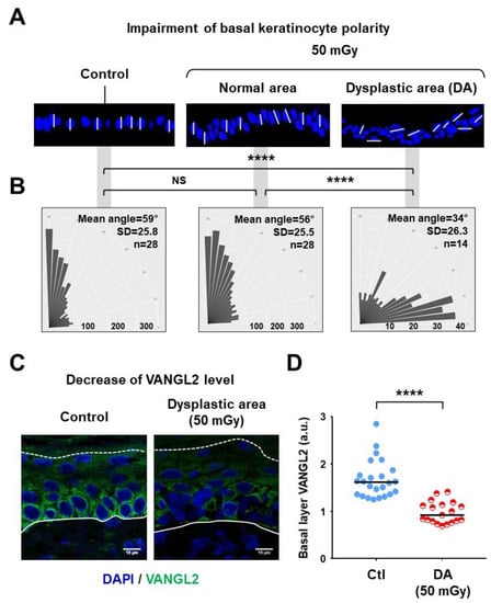 Perturbations of basal keratinocyte polarity in dysplastic epidermis areas of xenografts. (A) Imaging of basal keratinocyte nuclei orientation versus the dermo-epidermal junction (JDE) plane, after coloration with DAPI. Typical zoomed pictures of basal layer sections are shown, with white bars added to illustrate some perpendicular, oblique and parallel nuclei orientations. (B) Distribution of basal keratinocyte nuclei according to angle versus the JDE plan into 18 angle categories from 0° to 90°, characterized by automated image analysis. The vertical axis represents angle values and the horizontal axis numbers of cells in the different angle categories. Analysis was performed on 14 different xenografts for all conditions, n indicates numbers of analyzed dysplastic areas (NS p > 0.05; **** p < 0.0001, Mann–Whitney U test). (C) Immunofluorescence detection of VANGL2 protein. Representative pictures were selected for the visualization of VANGL2 in basal keratinocytes from normal epidermis regions, showing its decrease or absence in basal keratinocytes from dysplastic areas. Nuclei were colored with DAPI. (D) Quantification of VANGL2 fluorescence in the epidermis basal layer (arbitrary units, a.u.), showing a reduced signal within DAs. Dot plots cumulated the analyses of 24 normal regions from 14 control (Ctl) xenografts and 19 DAs from the 14 xenografts of the 50 mGy conditions. Bars correspond to median values. (**** p < 0.0001, Mann–Whitney U test).