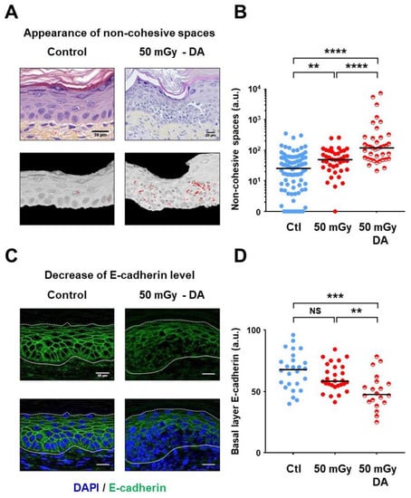 Defective cell-cell cohesiveness in dysplastic areas. (A) Typical pictures of HES sections illustrating cohesive epidermis in normal regions and the presence of visible non-cohesive spaces within DAs (top panel). Conversion of spaces into red pixels by automated image processing (bottom panel) for semi-quantitative analysis. (B) Semi-quantitative analysis of non-cohesive spaces based on red pixel conversion (arbitrary units, a.u.), revealing the presence of significant non-cohesive zones in DAs. Dot plots cumulated the analyses of 82 normal regions from control (Ctl) xenografts, 41 random regions from the 50 mGy xenografts and 39 selected regions corresponding to DAs in the 50 mGy xenografts. Bars correspond to median values (** p < 0.01; **** p < 0.0001, Mann–Whitney U test). (C) Immunofluorescence detection of E-cadherin. Representative pictures were selected for the visualization of E-cadherin expression in normal epidermis regions, showing its decrease or absence in basal keratinocytes from DAs. Nuclei were colored with DAPI. (D) Semi-quantitative analysis of E-cadherin (arbitrary units, a.u.), showing a lower signal within DAs. Dot plots cumulated the analyses of 26 normal regions from the 14 control (Ctl) xenografts and 20 DAs from the 14 xenografts of the 50 mGy condition. Bars correspond to median values (NS p > 0.05; ** p < 0.01; **** p < 0.0001, Mann–Whitney U test).