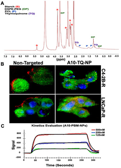 1H-NMR spectrum and cellular internalization of TQ-encapsulated PBM-NPs. (A) 1H-NMR spectra of starch, TQ, polyethylene glycol (PEG) and polycaprolactone (PCL), showing the conjugation of TQ-encapsulated-PBM-NPs. The 1H-NMR spectra were recorded on a Bruker 400 MHz spectrometer. (B) Cellular internalization of A10 aptamer-conjugated TQ-PBM-NPs in drug-resistant prostate cancer (PCa) cells (C4-2B-R and LNCaP-R) compared to non-targeting, empty PBM-NPs. Red: Texas red conjugated PBM-NPs; green: PSMA stained with FITC-conjugated antibody; blue: nuclei counterstained with 4′,6-diamidino-2-phenylindole (DAPI). Scale bar, 50 µM. (C) Surface Plasmon Resonance (SPR) analysis of binding interaction between the PSMA and A10 aptamer-conjugated PBM-NPs. A typical response curve from experimental data at different analyte concentrations (green, 125 nM; blue, 250 nM; red, 500 nM) shown the association (ka = 1.36 × 105) and dissociation (kd = 8.18 × 10−2) phase of A10-PBM-NPs and PSMA interactions. A kinetic analysis was performed using globally fitted to 1:1 binding model represented by black lines. Data were analyzed using the TraceDrawer evaluation software.