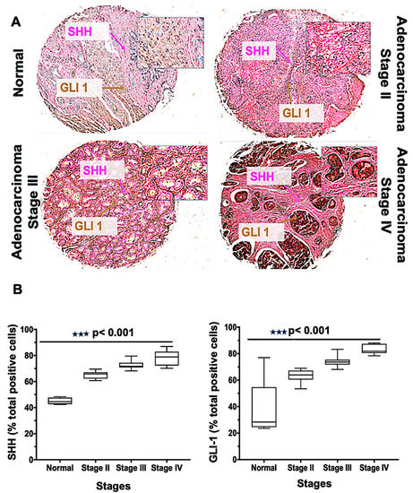 Glioma-associated oncogene homolog 1 (GLI-1), and sonic hedgehog (SHH) expression in human prostate tissues. (A) Tissues from normal prostate and adenocarcinoma stages II, III, and IV were stained with anti-SHH and anti-GLI1 antibodies. Representative cases showing immuno-intensities of SHH (Alkaline phosphatase (AP), magenta) and GLI-1 (diaminobenzidine (DAB), brown). An Aperio ScanScope Scanning system with a 40× objective lens captured digital images from the slide. Stained cells were categorized as to stain intensity 0 (blue), 1 + (yellow), 2 + (orange), and 3 + (red). There are differences (p < 0.001) between the normal and adenocarcinoma groups. (B) Box plots showing the percentages of cells positive for SHH and GLI1 from each diagnosis group.