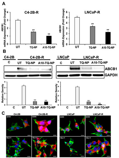 Gene expression changes in the ATP-binding cassette (ABC) transporter and the hedgehog (Hh) pathway in drug-resistant PCa cells. (A) Docetaxel (DTX)-resistant (C4-2B-R and LNCaP-R) PCa cells were treated with or without A10-conjugated TQ-NPs for 48 h. The expression levels of ABCB1 were measured by RT-PCR and expressed as the fold change relative to the controls (parental cells, C4-2B or LNCaP); 18S rRNA was used as an internal control for data normalization. The experiments were repeated thrice. The data, presented as means and standard errors of means (±SEM), were analyzed by Student’s t-test. The asterisks ** indicate p values ≤ 0.01. UT: untreated (DTX-resistant) (B) DTX-resistant PCa cells were treated with or without A10-conjugated TQ-NPs for 48 h, and ABCB1 protein expression was assessed by Western blots. GAPDH was used as an internal standard for equalizing the samples. The lower panel shows the densitometry of corresponding Western blots. UT: untreated (DTX-resistant); C: control (parent cells). The experiments were repeated thrice. The data are presented as means ± SEM; the asterisks ** indicate p values ≤ 0.01. (C) Immunofluorescence expression of SHH and GLI1 markers in PCa cells. The parental (C4-2B and LNCaP) and DTX-resistant (C4-2B-R and LNCaP-R) PCa cell lines were stained with anti-SHH and GLI-1 antibodies. Images were captured by an EVOS-FL fluorescent microscope with a 40× objective lens and with an appropriate filter. Red: SHH and GLI; green: F-actin cytoskeleton stained with Phalloidin 488; blue: nuclei counterstained with DAPI. Scale bar, 50 µM.