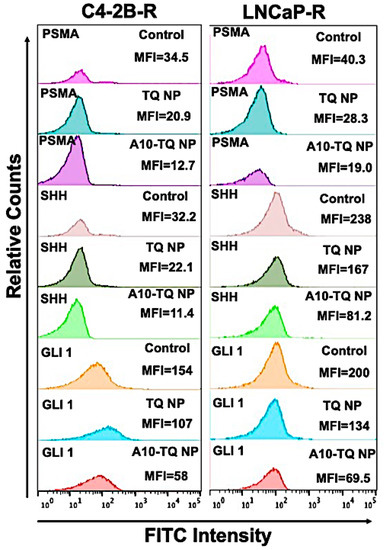 C4-2B-R and LNCaP-R cells were grown in six-well plates overnight and treated with empty NPs or TQ-NPs conjugated with or without the A10 aptamer for 48 h. Following our previous publication [30], the cells were washed with FACS buffer (2% FBS), harvested with Accutase, and counted with a hemocytometer (Countess II FL, Life Technology, Carlsbad, CA, USA). To assess the expression of PSMA, SHH, and GLI1, cells were fixed with 4% PFA, exposed to human Fc Block (BD Biosciences, San Jose, CA, USA), and stained with the primary antibodies for PSMA (2 µg/mL, R&D Systems, Minneapolis, MN, USA), SHH (1:100, Novus Biologicals, Littleton, CO, USA), and GLI1 (1:100, Novus Biologicals) overnight at 4 °C followed by an fluorescein isothiocyanate (FITC)-conjugated secondary antibody (for PSMA: Invitrogen, Carlsbad, CA, USA; for SHH and GLI1: Cell Signaling Technology, Danvers, MA, USA) at room temperature. Cells were washed twice and suspended in the FACS buffer. A Guava easyCyte HT (EMD Millipore, Billerica, MA, USA) flow cytometry instrument was used to analyze the data.