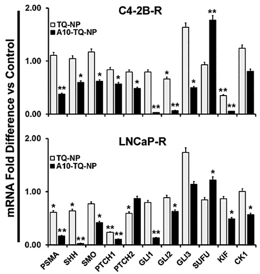 To confirm the effects on Hh signaling, we investigated the mRNA expression of Hh signaling molecules in DTX-resistant cells (C42B-R and LNCaP-R) treated with or without A10-conjugated TQ-NPs. Like the findings for protein expression, mRNA expression of these molecules was down-regulated in both types of cells treated with A10-TQ-NP (Figure 7). In C4-2B-R cells, the expression of SUFU was higher compared to that in cells treated with TQ-NPs. Upon treatment of cells with A10-conjugated NPs, SHH expression was lower in both cell lines compared to treatment with TQ-NPs. Moreover, a reduction in the Hh signaling cascade (GLI1, GLI2, KIF, CK1, SMO, PTCH1, and PTCH2) was evident for cells treated with A10-TQ-NPs. Thus, PCa is Hh dependent, and inhibiting Hh with NPs could provide a new avenue for therapy and improved quality of life for patients.