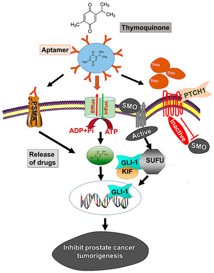 In conclusion, our finding that TQ inhibits Hh signaling provides the perspective that natural anti-cancer compounds can be safer, more available, and more affordable for treating cancers driven by Hh signaling. In the present study, we found that aptamer-based NPs carrying a natural drug (TQ) allowed a reduced drug concentration, binding to a specific target, and the delivery of the agent to the target cells. Along with demonstrating that TQ controls altered the expression of the Hh pathway molecules in PCa, we provide evidence that drug resistance and the Hh pathway are interlinked and that TQ reverses the overexpression of ABC transporter genes. In summary, we have devised a new strategy involving the use of aptamer-bound anti-cancer NPs for the treatment of cancers controlled by the Hh pathway.
