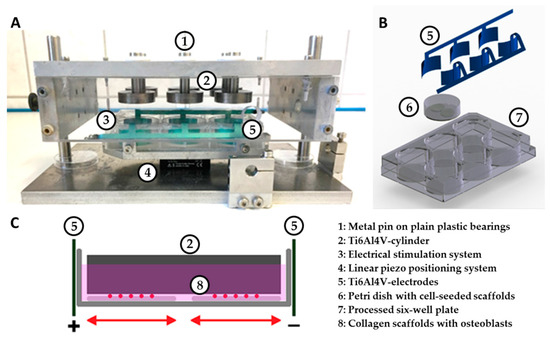 Therefore, this study aimed to establish and evaluate an in vitro system for biophysical stimulations on human osteoblasts. While different variations of biophysical stimulation have been investigated, including interface micromotions [20,21,22] and electrical stimulation via direct current [23,24], inductive coupling [25,26,27], and capacitive coupling [25,28,29,30,31,32], the exact molecular and cellular mechanisms by which osseointegration is influenced remain unclear. With a better understanding of these stimulations at a cellular level, the effectiveness of the enhancement of bone regeneration in the clinical setting can be improved. Therefore, we created a system that allowed us to apply capacitively coupled alternating electric fields and harmonically oscillating micromotions on collagen scaffolds seeded with human osteoblasts. The ability to apply mechanical stress via micromotions and electrical stimulation individually and in combination allowed the investigation of each treatment separately as well as their interaction.