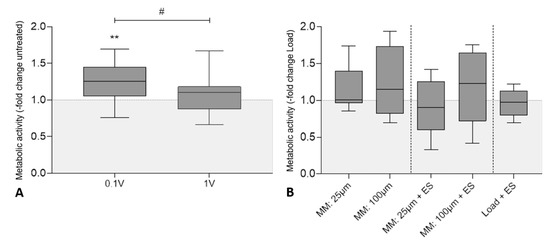 Metabolic activity of human osteoblasts after biophysical stimulation. (A) Results of electrical stimulation (ES) with 60 kHz and either 100 mVRMS or 1 VRMS. (B) Results of micromotions and electrical stimulation with 60 kHz and 1 VRMS (MM + ES) compared to osteoblasts treated solely with micromotions (MM) and osteoblasts treated with titanium bodies and electrical stimulation (Load + ES). Untreated cells with or without titanium bodies served as controls. The metabolic activity was determined colorimetrically by the conversion of tetrazolium salt to formazan. Results are presented as box plots related to the untreated controls (n ≥ 6). ** p < 0.01 compared to the untreated controls (Wilcoxon’s signed-rank test); # p < 0.05 comparison between different voltages (Mann–Whitney U test).