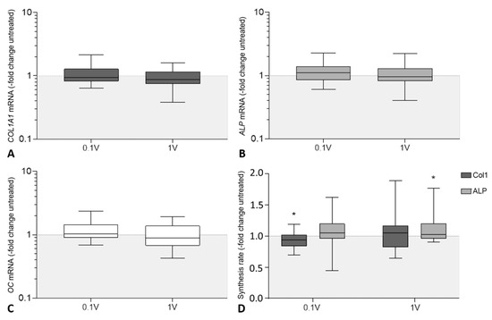 Evaluation of osteogenic differentiation of human osteoblasts following electrical stimulation [ES] with 60 kHz and either 100 mVRMS or 1 VRMS. Relative gene expression of osteogenic markers for bone formation: (A) collagen type I alpha 1 chain (COL1A1), (B) alkaline phosphatase (ALP) and (C) osteocalcin (OC). Gene expression levels of osteogenic marker were determined via semi-quantitative polymerase chain reaction (qPCR). Results are presented as boxplots of the percentage of 2(−ΔΔCt) related to untreated controls (n ≥ 24). (D) Synthesis rates of osteogenic markers procollagen type 1 and alkaline phosphatase (ALP). The release of type I C-terminal collagen propeptide in the cell culture supernatant was determined using ELISA and related to the total protein concentration. The ALP activity was determined colorimetrically by the hydrolysis of p-nitrophenyl phosphate. Results are presented as box plots related to untreated controls (n ≥ 15). * p < 0.05 compared to the untreated controls (Wilcoxon’s signed-rank test).