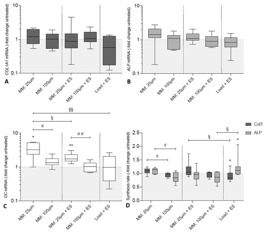 Evaluation of osteogenic differentiation of human osteoblasts following biophysical stimulation. Relative gene expression of osteogenic markers for bone formation: (A) collagen type I alpha 1 chain (COL1A1), (B) alkaline phosphatase (ALP), and (C) osteocalcin (OC) in human osteoblasts after treatment with micromotions and electrical stimulation (MM + ES) compared to osteoblasts treated solely with micromotions (MM) and osteoblasts treated with titanium bodies and electrical stimulation (Load + ES). Gene expression levels of COL1A1, ALP, and OC were determined via semi-quantitative polymerase chain reaction (qPCR). Results are presented as boxplots of the percentage of 2(−ΔΔCt) related to loaded controls (n ≥ 6). (D) Synthesis rates of osteogenic markers procollagen type 1 and alkaline phosphatase (ALP) in human osteoblasts. The release of type I C-terminal collagen propeptide in the cell culture supernatant was determined using ELISA and related to the total protein concentration. The ALP activity was determined colorimetrically by the hydrolysis of p-nitrophenyl phosphate. Results are presented as box plots related to the loaded controls (n ≥ 6). * p < 0.05, ** p < 0.01 compared to the loaded controls (Wilcoxon’s signed-rank test); # p < 0.05, ## p < 0.01 comparison between different parameters (Mann–Whitney U test); § p < 0.05, §§ p < 0.01 comparison between different treatment groups (Mann–Whitney U test).