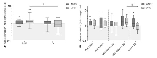 Relative gene expression of genes responsible for bone remodeling: tissue inhibitor of metalloproteinase 1 (TIMP1) and osteoprotegerin (OPG) in human osteoblasts after biophysical stimulation. (A) Results of electrical stimulation (ES) with 60 kHz and either 100 mVRMS or 1 VRMS. (B) Results of micromotions and electrical stimulation (MM + ES) compared to osteoblasts treated solely with micromotions (MM) and osteoblasts treated with titanium bodies and electrical stimulation (Load + ES). Gene expression levels of TIMP1 and OPG were determined via semi-quantitative polymerase chain reaction (qPCR). Results are presented as boxplots of the percentage of 2(−ΔΔCt) related to the untreated controls (n ≥ 6). * p < 0.05; ** p < 0.01 compared to the untreated controls (Wilcoxon’s signed-rank test); # p < 0.05 comparison between different voltages (Mann–Whitney U test); § p < 0.05 comparison between different treatment groups (Mann–Whitney U test).