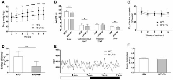 After eight weeks on the HFD, mice presented biochemical and metabolic alterations that characterize the state of obesity compared to mice given a control diet (CD, Figure S1A–E). After eight weeks of HFD feeding, obese mice were treated with tributyrin (Tb) or water for six weeks. We have previously demonstrated that Tb treatment has no effect on body weight or glucose metabolism in CD-fed mice []. In contrast, Tb-treated HFD-fed mice gained less body weight than mice treated with water after the end of the experimental protocol (Figure 1A,B). A reduction in subcutaneous WAT (Figure 1B) was observed in Tb-treated animals compared to the nontreated HFD group. These findings may be partly explained by the reduction in energy efficiency in the Tb-treated mice, even though there were no changes in food or caloric intake between the groups (Figure 1C,D). A decrease in the respiratory coefficient was also found in Tb-treated mice (Figure 1E). No significant difference in energy expenditure was observed between the experimental groups (Figure 1F).
