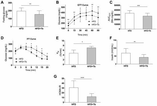 Treatment with Tb improved fasting glucose (Figure 2A), glucose tolerance (Figure 2B,C) and the response to insulin administration (Figure 2D,E). Additionally, a reduction in insulin concentration and improvement of insulin resistance, analyzed by HOMA-IR, were observed in Tb-treated mice (Figure 2F,G). Tb did not affect muscle metabolism, since soleus skeletal muscle metabolism after in situ stimulation with insulin was not different between the experimental groups (HFD vs. HFD+Tb, data not shown). This result is different from what we previously observed when we tested Tb for the prevention of obesity [].