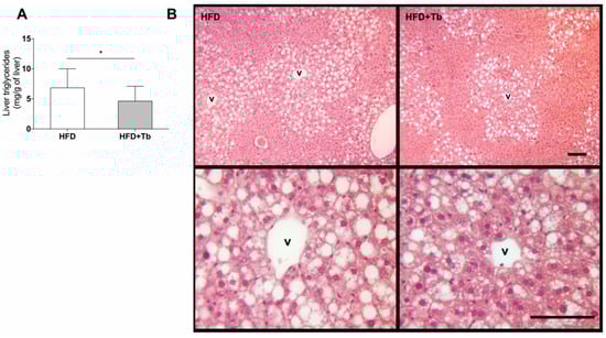 Tb treatment reduced the accumulation of triglycerides (TAG) in the liver and attenuated the signals of hepatic steatosis. (A) Triglycerides (TAG) were measured in liver samples from HFD-fed mice, and treated (HFD+Tb) or not (HFD) with Tb. Data are presented as mean ± SD (n = 12–17 mice per group). * p < 0.05 HFD vs. HFD+Tb, Student’s t-test. (B) Representative image of the liver histology (three mice from each group were analyzed). V, lobular central vein. Scale bars represent 100 μm.