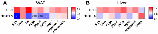 Next, we evaluated the expression of proinflammatory genes and macrophage markers in liver and WAT. In the liver, no significant difference was observed among the experimental groups, despite a general trend toward a reduction in inflammatory genes (Figure 4B). In contrast, the treatment of obese mice with Tb reduced the expression of inflammatory markers, including Il-1β and Mcp-1 and of M1 macrophages (Cd11c and F4/80) in the WAT (Figure 4A). These results indicate that Tb may reduce inflammation in the WAT of obese animals. Adiponectin and sterol regulatory-element binding (Srebp) were also analyzed in WAT and liver samples, respectively, but no difference was observed.