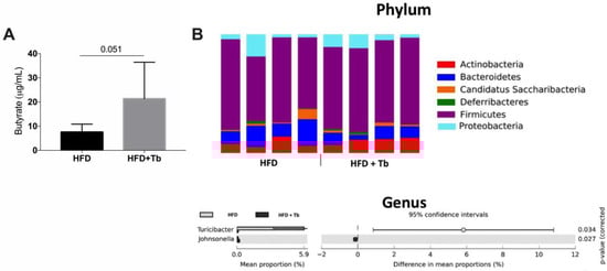 Tb treatment increased butyrate systemic concentrations with minimal effects on the microbiota. (A) Butyrate concentration was measured in blood samples at the end of the protocol. Data are presented as mean ± SD (n = 6, 7), Student’s t-test. (B) Analysis of fecal microbiota composition of HFD-fed mice treated or not with Tb showing phylum and genus (only genus statistically significant, p < 0.05; 95% of confidence intervals) distribution.