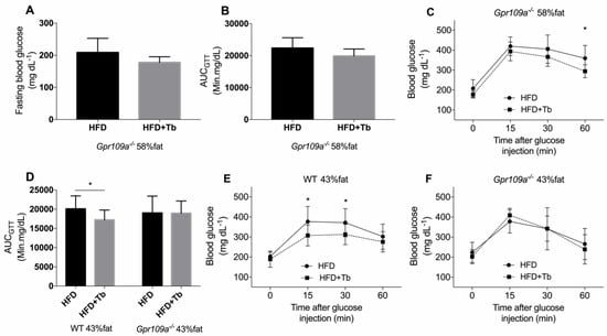 Tb improved glucose homeostasis in obese mice through a GPR109A-dependent mechanism. (A) Glucose quantification in samples from 6 h fasted Gpr109a−/− mice (n = 8, 9 mice per group). (B) Incremental area of blood glucose (GTT) at the 12th week of the protocol in Gpr109a−/− mice (n = 8, 9 mice per group). (C) GTT curves for Gpr109a−/− mice are presented (n = 8,9 mice per group). (D) Incremental area of blood glucose (GTT) at the 12th week of the protocol in WT and Gpr109a−/− mice (n = 9–14 mice per group). (E) GTT curves of WT mice are presented (n = 12–14 mice per group). (F) GTT curves of Gpr109a−/− mice are presented (n = 9 mice per group). For this experiment, GTT was performed with the use of 1 g/kg glucose and a blood glucose meter (Accu-Check Performa®). Data are presented as mean ± SD (n is presented for each result). * p < 0.05 HFD vs. HFD+Tb. Student’s t-test.