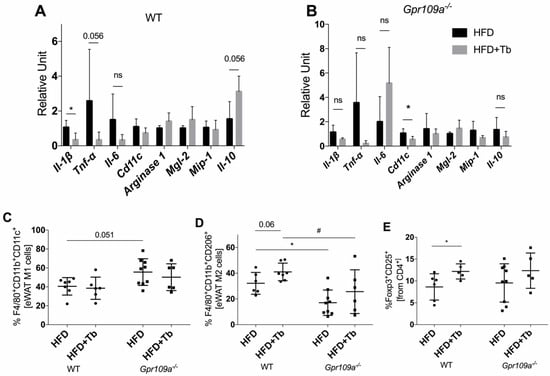 Tb attenuated the inflammation in WAT of obese WT mice through a GPR109A-dependent mechanism. (A,B) Effect of Tb treatment on the mRNA expression of inflammatory markers and cell markers (n = 4, 5 mice per group). * p < 0.05 HFD vs. HFD+Tb. Not significant (ns). (C) Frequency of F4/80+CD11b+CD11c+ M1 macrophages in WAT of obese mice treated or not with Tb (n = 6–9 mice per group). (D) Frequency of F4/80+CD11b+CD206+ M2 macrophages in WAT of obese mice treated or not with Tb (n = 6–9 mice per group). * p < 0.05 comparing HFD WT vs. HFD Gpr109a−/− mice. # p < 0.05 comparing HFD+Tb WT vs. HFD+Tb Gpr109a−/− mice. (E) Regulatory T cells (CD4+CD25+Foxp3+) were analyzed in WAT of WT and Gpr109a−/− mice (n = 5–9 mice per group). * p < 0.05 comparing HFD vs. HFD+Tb. Results were analyzed using Mann–Whitney (A,B) or by two-way ANOVA and Bonferroni as post-test (C–E).