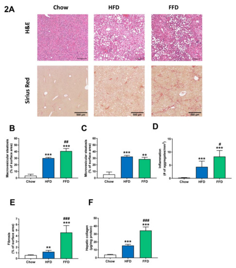 Representative images of liver cross-sections stained with hematoxylin and eosin (H&E) or Sirius Red (A) and quantitative analysis (B–F) from Ldlr−/−.Leiden mice fed a healthy chow diet or fed a high-fat diet (HFD) containing lard or a fast food diet (FFD) containing milk fat for 28 weeks. Macrovesicular (B) and microvesicular (C) steatosis as a percentage of total liver area, inflammation as number of inflammatory aggregates per mm2 microscopic field (D), and hepatic fibrosis were analyzed as percentage Sirius Red of surface area (E) or biochemically analyzed hepatic collagen/mg protein (F). Values represent mean ± SEM for ≥8 mice per group. ** p < 0.01 and *** p < 0.001 vs. chow; # p < 0.05, ## p < 0.01 and ### p < 0.001 FFD vs. HFD.