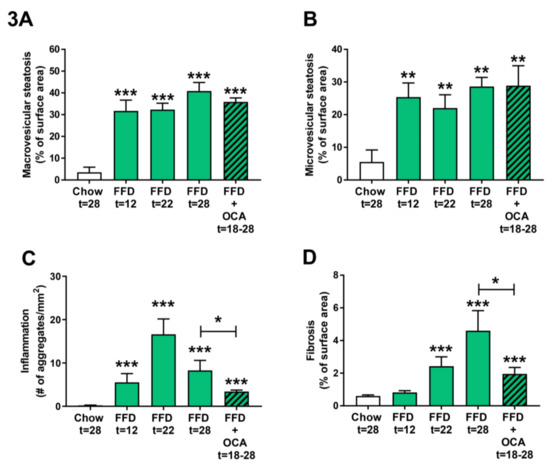 Quantitative analysis of non-alcoholic steatohepatitis (NASH) from Ldlr−/−.Leiden mice fed a healthy chow diet for 28 weeks or fed a fast food diet (FFD) containing milk fat for 12, 22, or 28 weeks. Data of FFD for 12 weeks were obtained by taking a liver biopsy of the mice that continued on the FFD for 22 weeks and are from a separate group of animals than mice that were fed the different diets for 28 weeks. In addition, mice were fed the FFD and treated with a relatively low dose of obeticholic acid (OCA) (10 mg/kg/d) from week 18 to 28. Macrovesicular (A) and microvesicular (B) steatosis as the percentage of total liver area, inflammation as the number of inflammatory aggregates per mm2 microscopic field (C), and hepatic fibrosis as the percentage of Sirius Red of surface area (D) were analyzed. Values represent mean ± SEM for ≥8 mice per group. ** p < 0.01 and *** p < 0.001 vs. chow or * p < 0.05 FFD + OCA vs. FFD t = 28 (as indicated by bar).