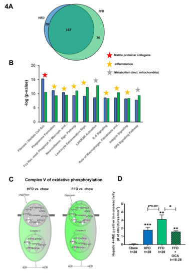 The shared top 10 most enriched pathways for HFD and FFD are shown in Figure 4B and contain important pathogenic pathways such as ‘Fibrosis/Stellate cell activation’, metabolic pathways such as ‘LXR/RXR Activation’, and ‘GP6 Signaling Pathway’ and predominantly inflammatory pathways. Almost all (166 out of 167) of the overlapping, shared pathways were regulated in the same direction by both diets. For the 20 pathways uniquely affected by HFD, the direction of regulation was the same as with FFD, but the FFD effect was less pronounced and did not reach statistical significance. The top 3 pathways of this portion of the Venn diagram were pathways critical for cholesterol biosynthesis (‘Cholesterol biosynthesis III, II and I’ were more downregulated on the HFD as compared to FFD). For the 70 pathways uniquely affected by FFD, the direction of most pathways (68 out of 70) was the same with HFD, but HFD effects were more modest and not significant. A most remarkable difference between FFD and HFD was revealed by the two most enriched pathways of this specific portion of the Venn diagram: ‘Oxidative Phosphorylation’ and ‘Mitochondrial Dysfunction’, both of which were uniquely affected by FFD. The pathway ‘Oxidative phosphorylation’ is a section of the broader pathway ‘Mitochondrial Dysfunction’, and although clearly downregulated by both diets, more genes were downregulated on the FFD, specifically in the different complexes of the electron transport chain and ultimately resulting in the downregulation of ATP synthases with FFD only (Figure 4C), indicating that FFD has a greater detrimental effect on mitochondrial function than HFD. This notion was further substantiated by measuring hepatic 4-hydroxynonenal (4-HNE), a marker for oxidative stress, and we found a significant upregulation of this marker for HFD and FFD as compared to the chow diet (33-fold, p < 0.001 and 57-fold, p = 0.003, respectively; Figure 4D).